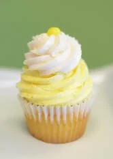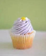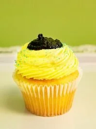 Lemon cake filled with a tangy lemon curd, topped with lemon buttercream with a hint of lavender mixed in, sugar sprinkles, and a lemon head candy.