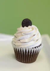 Rich chocolate cake with Oreo crumbles mixed in and a whole Oreo baked in the bottom, topped with cream cheese Oreo icing and a mini-Oreo on top.