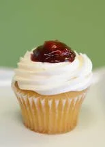 A cheesecake cupcake with cream cheese filling topped with cream cheese icing and cherry pie filling. It can't get any cream cheesier than this!