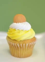 Lightly flavored banana cake filled with delicious banana cream-pie pudding, topped with cream cheese frosting and a whole vanilla wafer.