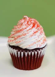 Moist red velvet cake with a cream cheese center, topped with cream cheese frosting & red sugar sprinkles.