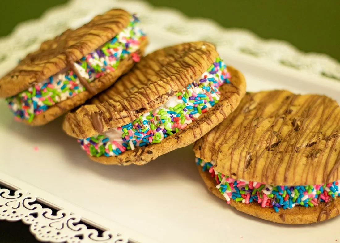 Cookie sandwiches are made with 2 chocolate chip cookies, buttercream frosting, sprinkles, and chocolate drizzle.