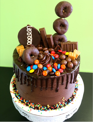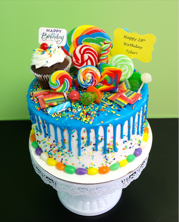 Your choice of cake flavor, frosted with butter cream frosting, topped with a colored white chocolate ganache drip, tons of candy, suckers, a whole cupcake and a Happy Birthday Sign.