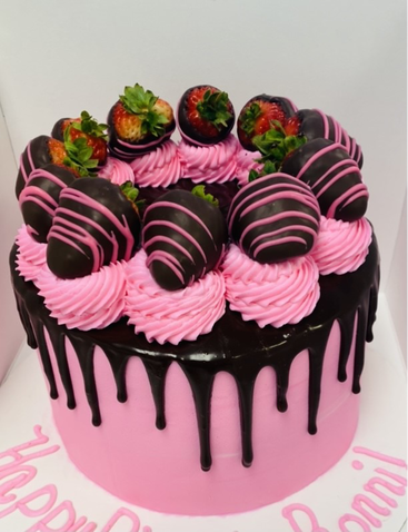 Your choice of cake flavor, frosted with your choice of colored buttercream frosting, topped with a chocolate ganache drip, swirls of frosting and whole chocolate covered strawberries.