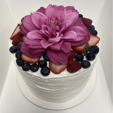 Your choice of cake flavor, frosted with buttercream frosting, topped with a silk flower, strawberries, blueberries and raspberries.