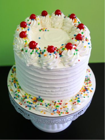 French vanilla cake covered in vanilla buttercream, topped with swirls of frosting, birthday sprinkles and cherry sours.