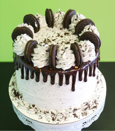 Rich chocolate cake frosted with OREO buttercream, topped with swirls of frosting, OREO crumbles, and whole OREO cookies.